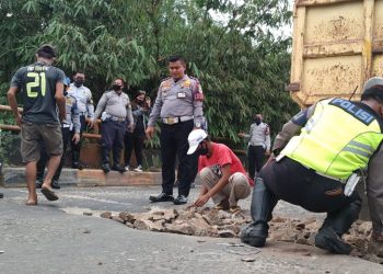 Cilegon, CNO - Puluhan anggota Satlantas Polres Cilegon bersama petugas dari Dinas Perhubungan Kota Cilegon bergotong royong menambal jalan berlubang, ...