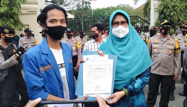 Uyun mendatangi mahasiswa untuk menyerap aspirasi mereka yang meminta seluruh anggota DPRD Kota Cilegon menandatangani pernyataan sikap pencabutan UU Cilaka.